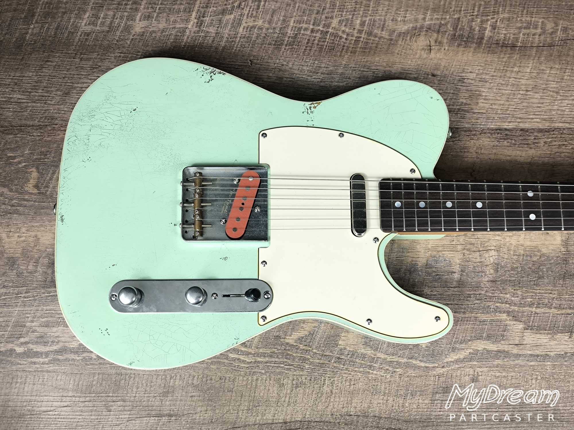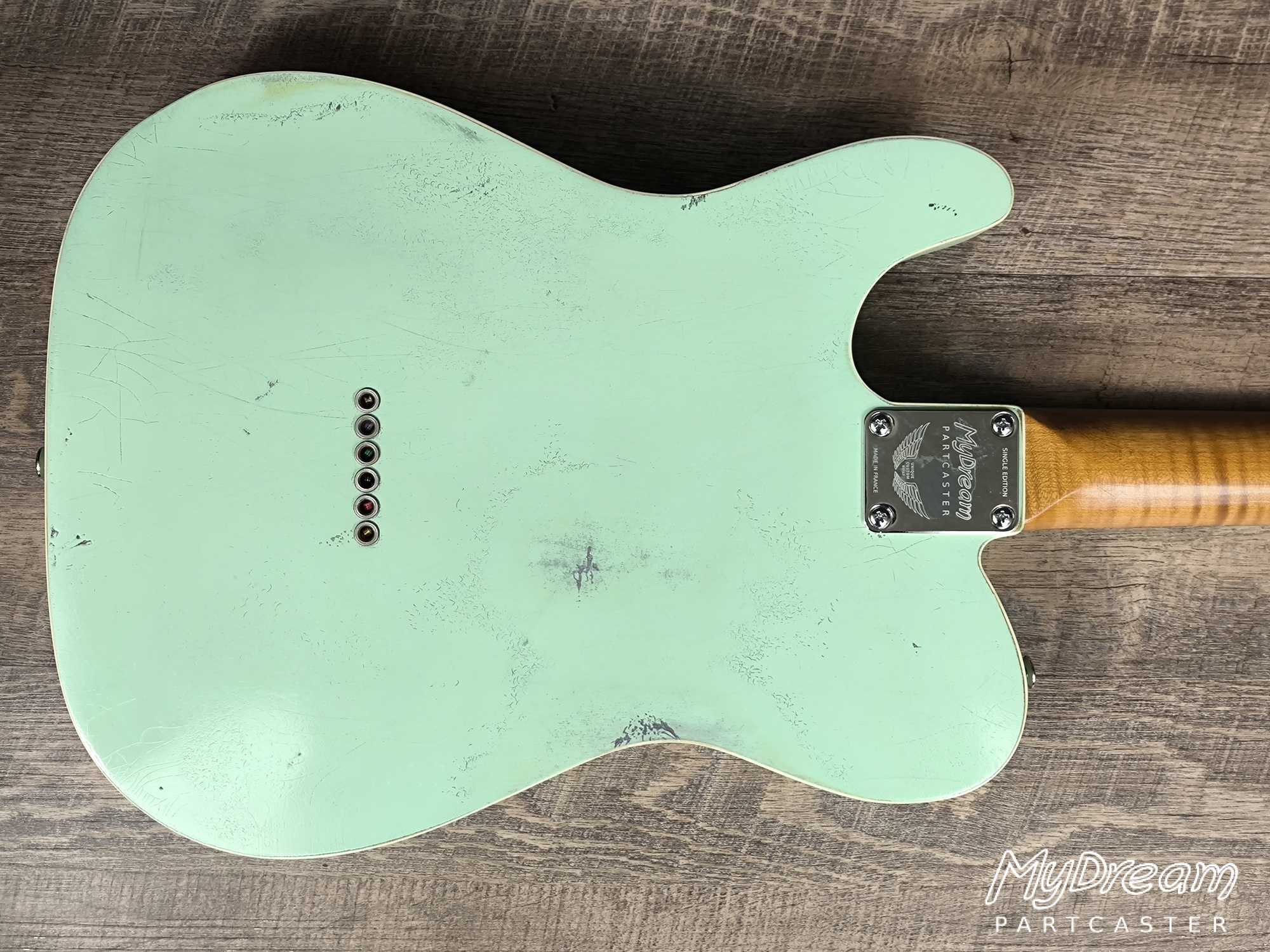 Cette partcaster propose une belle finition nitro relic Surf Green et des bindings. Elle dispose d'un superbe manche de luthier en érable ondé torréfié avec une touche en palissandre et des repères en nacre.