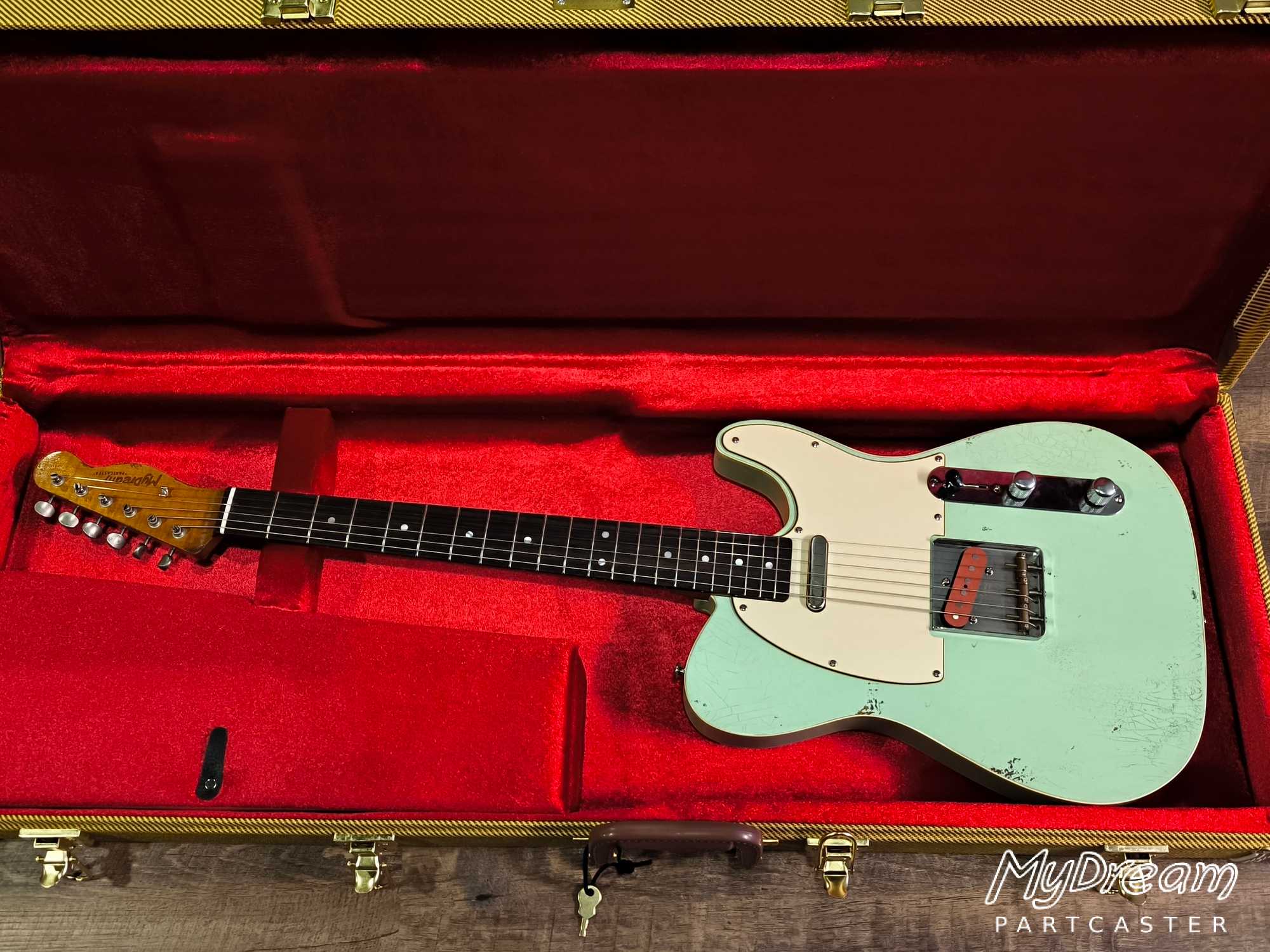 Superbe partcaster au look vintage marqué, finition Heavy Relic Sherwood Green laissant apparaître le Sunburst.